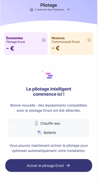 Si vous avez des équipements éligibles au pilotage (vous avez une batterie, un Shelly pour piloter votre chauffe-eau, une borne et/ou une PAC installée par Ensol), vous pourrez cliquer sur "Activer le pilotage Ensol".