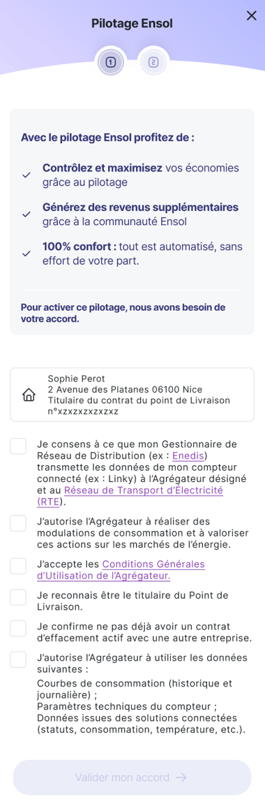 Il vous faudra accepter les conditions d'utilisation une par une avant de pouvoir valider votre accord, afin de donner à notre partenaire-agrégateur ainsi qu'à RTE et Enedis l'accès à vos données de consommation. Pour plus d'informations sur le consentement au pilotage, rendez-vous sur En quoi consiste le consentement pour le pilotage Ensol ?
