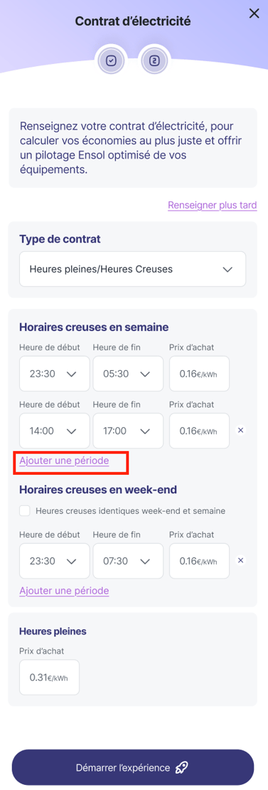Il vous faudra ensuite renseigner votre contrat d'électricité, avec le détail de vos heures creuses et des tarifs associés. Cette étape est importante: elle nous permet d'adapter au mieux le pilotage à vos contraintes ainsi que calculer au mieux vos économies.