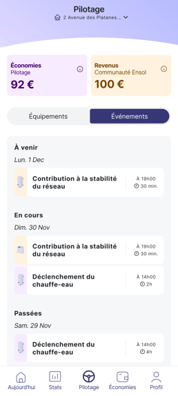 La liste des évènements vous permettra de savoir quand vos équipements ont été pilotés par Ensol, et si vous avez eu ou aurez des sollicitations d'équilibrage au réseau.